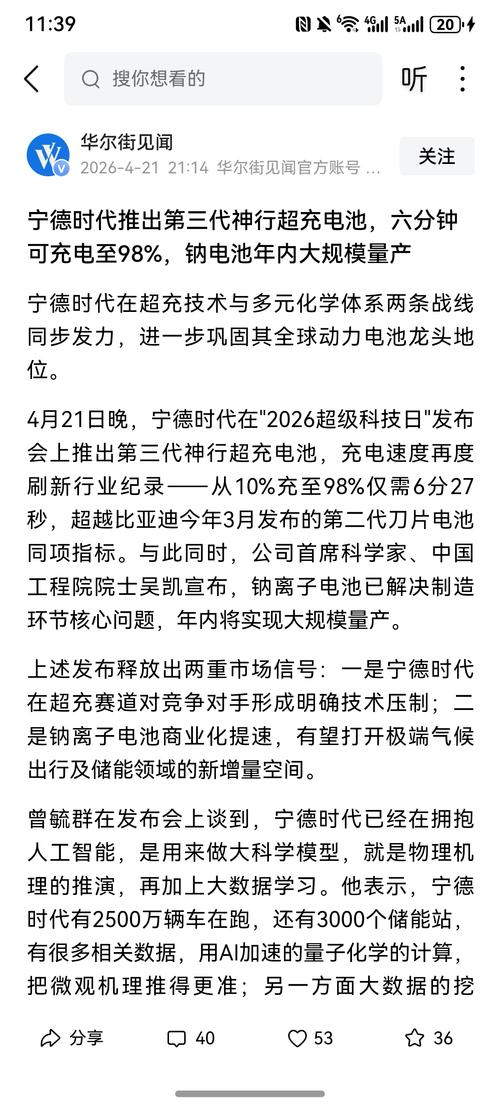 $圣泉集团(SH605589)$人民财讯4月21日电,4月21日,在宁德时代2026年“超级科技日”发布会上,公司首席科学家、中国工程院院士吴凯表示,钠离子电池在高温、极寒等出行场景以及储能领域有广阔场景,目前宁德时代已经解决了钠离子电池制造环节的核心问题,年内将实现大规模量产。