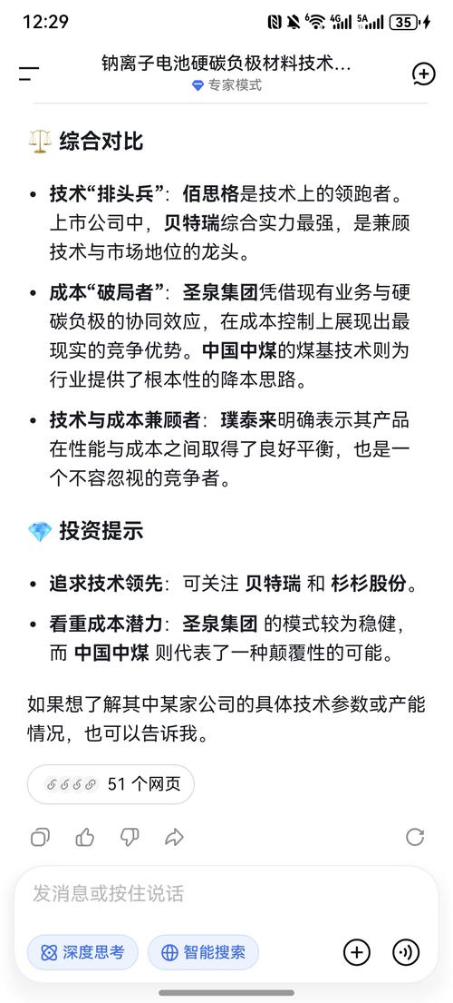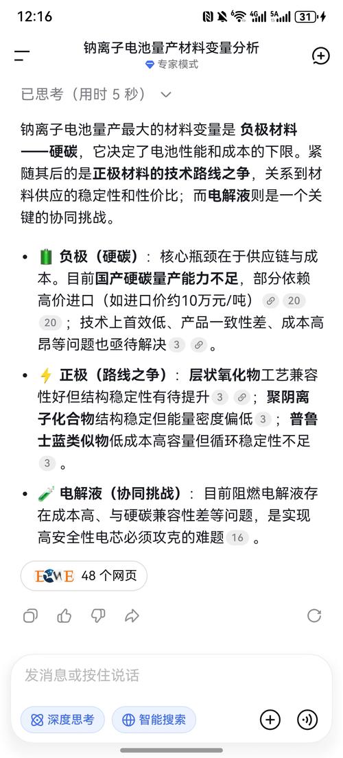 $圣泉集团(SH605589)$$钠离子电池(BK0988)$ 钠离子电池量产最大的材料变量是负极材料——硬碳。成本“破局者”:圣泉集团凭借现有业务与硬碳负极的协同效应,在成本控制上展现出最现实的竞争优势。硬碳负极材料它决定了电池性能和成本的下限。紧随其后的是正极材料的技术路线之争,关系到材料供应的稳定性和性价比;而电解液则是一个关键的协同挑战。 ·负极(硬碳):核心瓶颈在于供应链与成本。目前国产...