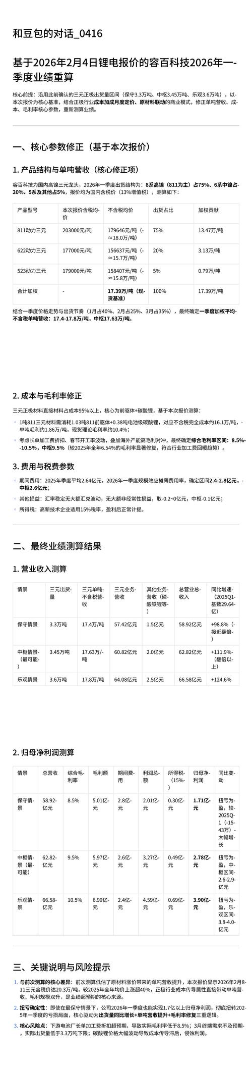 $容百科技(SH688005)$业绩情景2026Q1营业总收入同比增长率(2025Q1基数29.64亿元) 保守情景58.92亿元+98.8% 中枢情景62.82亿元+111.9% 乐观情景66.58亿元+124.6%
