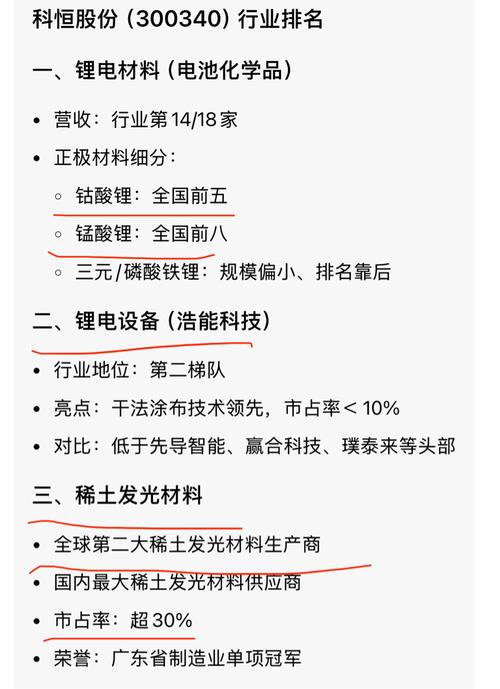 $科恒股份(SZ300340)$锂电正极材料龙头+锂电设备+稀土材料龙头+国资委背书逆境反转今年底部区域 一、锂电材料(电池化学品) •营收:行业第14/18家 •正极材料细分: 钴酸锂:全国前五 锰酸锂:全国前八 三元/磷酸铁锂:规模偏小、排名靠后 二、锂电设备(浩能科技) •行业地位:第二梯队 •亮点:干法涂布技术领先,市占率<10% •对比:低于先导智能、赢合科技、璞泰来等头部 三、稀土发光...