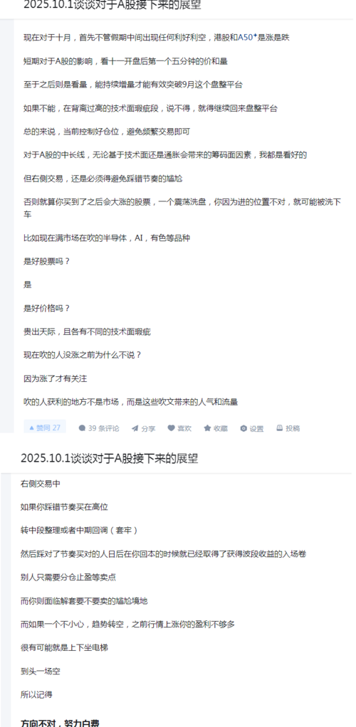 首先承接9月总结做一个分析的连续 2025.10.1谈谈对于A股接下来的展望 当时提到 需要持续增量,才能突破9月的盘整平台 准确点说,应该是“成功”突破 有量,代表这个位置尽管指标族群基本面估值贵出天际,各有各的技术面瑕疵 但市场就是源源不断的有新增资金进场,买走所有这个位置的主动卖盘 那么行情自然就可以不顾技术面瑕疵持续往上 但实际情况是什么? 指数不断过高,但是市场的“量”跟不上 客观就说明...
