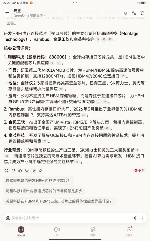 $澜起科技(SH688008)$研发HBM内存连接芯片(接口芯片)的主要公司包括澜起科技(MontageTechnology)、Rambus、合见工软和奎芯科技等。 核心公司详情: 澜起科技(股票代码:688008):全球内存接口芯片龙头,是HBM生态中关键的配套芯片供应商。 产品:研发第二代MRCD/MDB芯片,为HBM4/HBM3E提供高速信号缓冲和位宽扩展,支持12800MT/s,适配HBM...