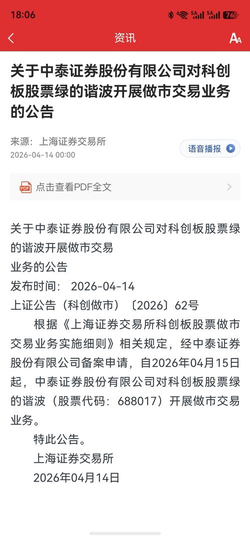 公告 关于中泰证券股份有限公司对科创板股票绿的谐波开展做市交易业务的公告