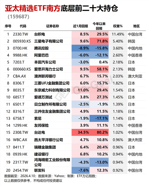 最近看了下亚太精选ETF(SZ159687)的持仓,台积电、三星电子、SK海力士、东京电子、联发科这些,基本就是全球AI供应链的顶流玩家。#宁王再新高新能源卷土重来#