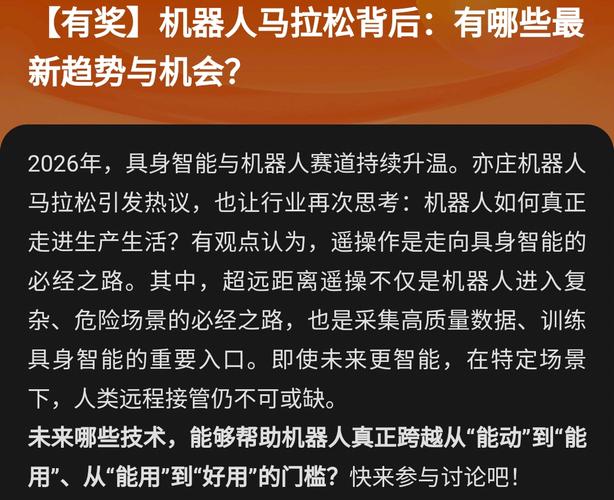 $当虹科技(SH688039)$ $神剑股份(SZ002361)$ $天齐锂业(SZ002466)$ 机器人马拉松背后的新趋势与机会 2026年,随着亦庄机器人马拉松的举办,具身智能与机器人赛道从概念验证阶段加速迈向实际应用阶段。 遥操作成为关键过渡技术 行业普遍认为,完全自主的具身智能尚需时日,而“遥操作”是连接当前技术水平与未来全自主智能的桥梁。超远距离遥操技术不仅是让机器人进入核辐射、深海、...