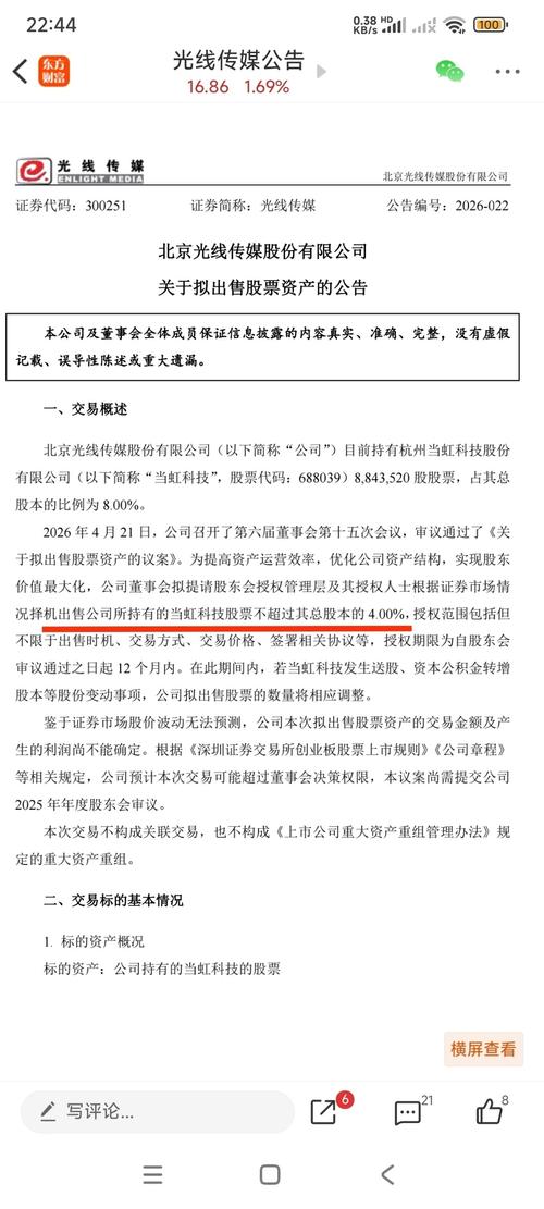 资讯 光线传媒:拟出售所持当虹科技不超4%股份