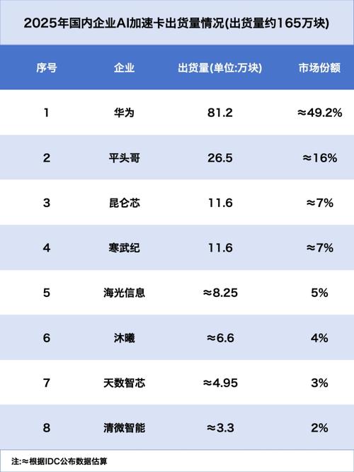 $海光信息(SH688041)$2025年国产ai芯片市场占有率,海光超出预期。 华为、阿里、百度大多是自产自销,寒武纪、海光信息、沐曦股份是真正市场销售。海光居然能销售8.25万颗。市值赶超寒武纪