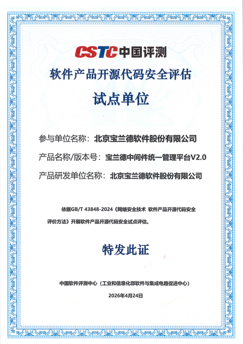 4月24日,由中国软件评测中心主办的2026开源安全治理实践与协同共治建设研讨交流会在北京顺利举办。本次会议将围绕“开源安全治理与软件供应链安全”核心议题,汇聚了行业专家与企业代表,共同探讨软件产业的安全发展之路。 宝兰德凭借在基础软件领域多年的经验积淀与技术创新,荣获两项极具分量的行业资质——软件产品开源代码安全评估试点单位和基础软件质量控制与技术评价工业和信息化部重点实验室-软件供应链安全推进...