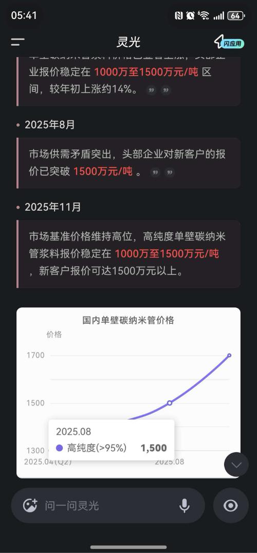 天奈科技的市场定位 国产替代:打破了俄罗斯OCSiAl在高端单壁碳纳米管市场(特别是航天领域)的垄断,价格优势约30%。 产业链布局:公司已规划"年产450吨单壁碳纳米管项目",为国内首次百吨级规模化量产,满足航天等高端领域需求。 前沿探索:天奈科技正研发单壁碳纳米管纤维(强度达50GPa),未来可用于航天器外骨骼、太空电梯等前沿项目。