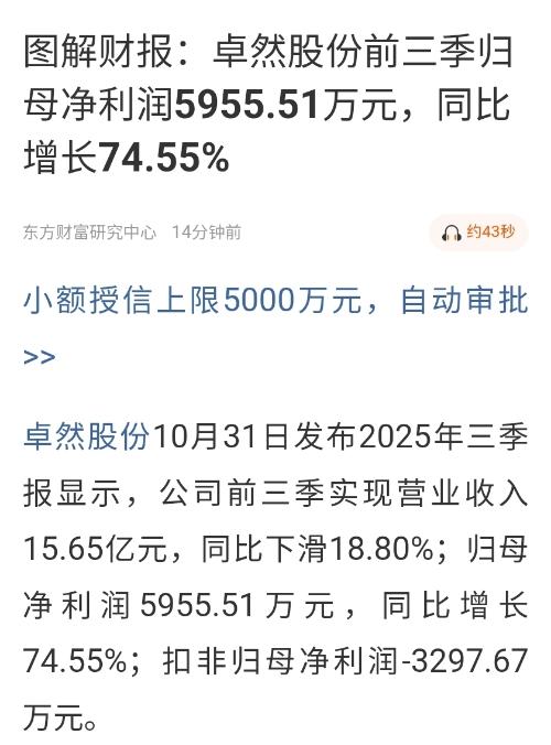 资讯 卓然股份:2025年前三季度净利润5955.51万元 同比增长74.55%