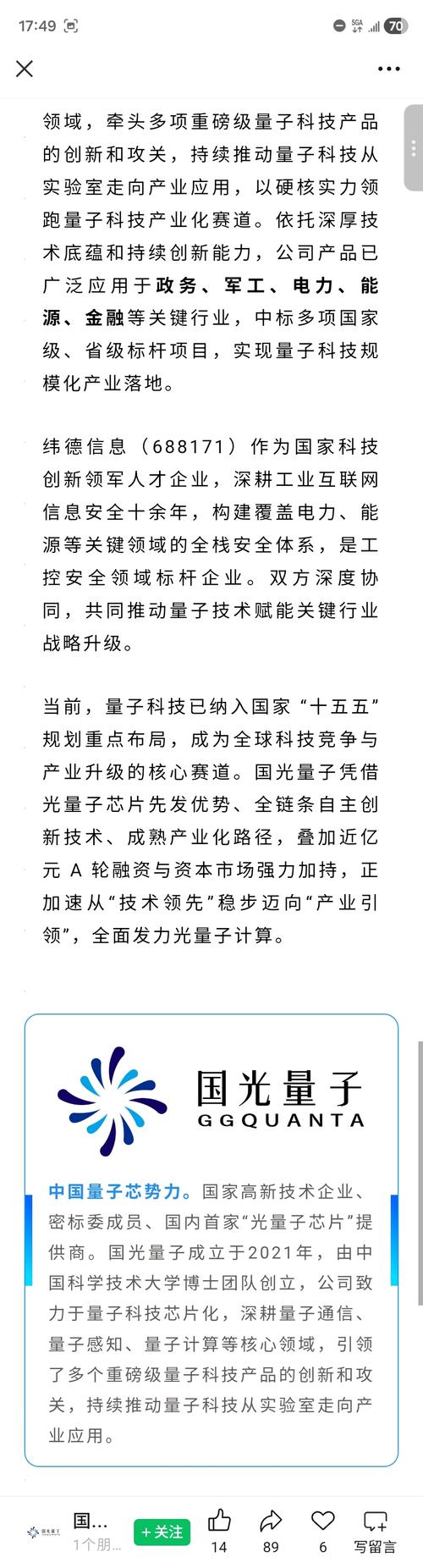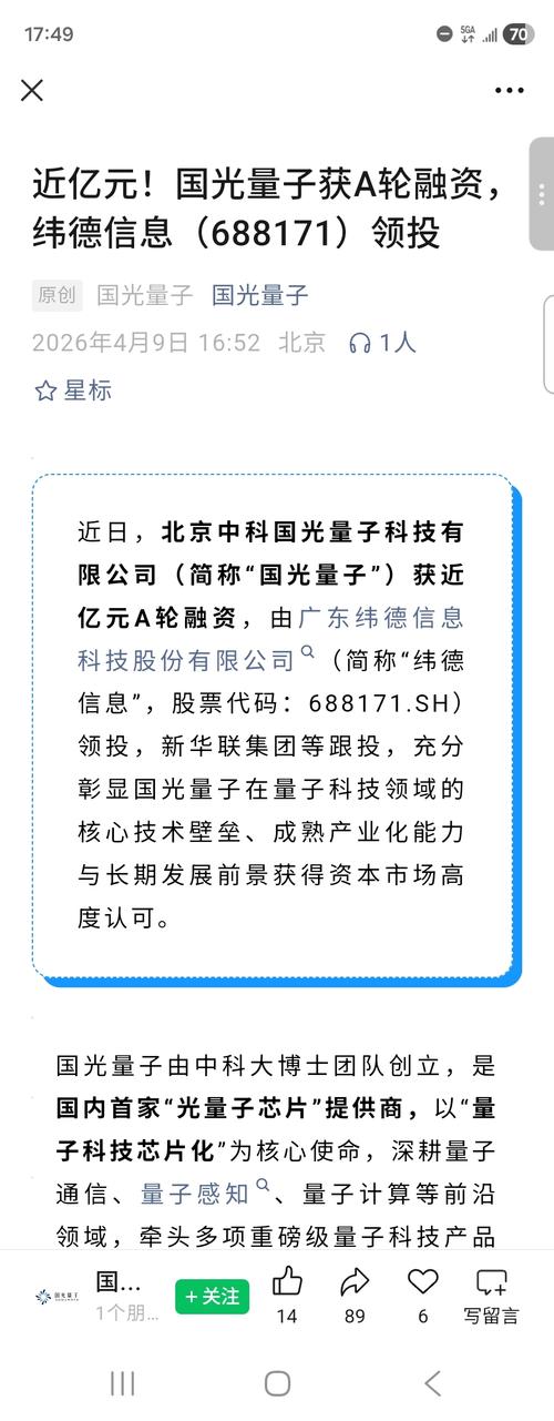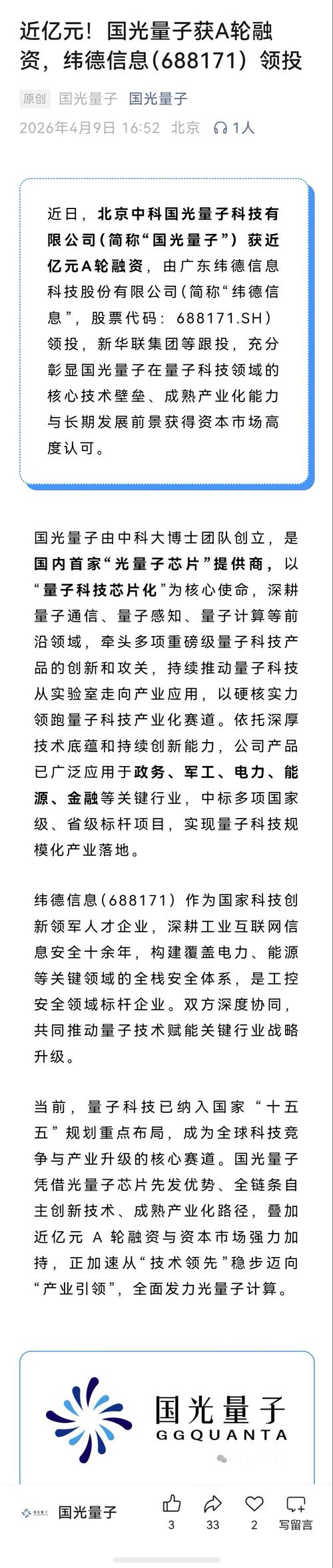 $纬德信息(SH688171)$近日,北京中科国光量子科技有限公司(简称“国光量子”)获近亿元A轮融资,由广东纬德信息科技股份有限公司(简称“纬德信息”,股票代码:688171.SH)领投,新华联集团等跟投,充分彰显国光量子在量子科技领域的核心技术壁垒、成熟产业化能力与长期发展前景获得资本市场高度认可。