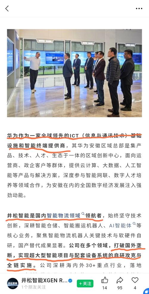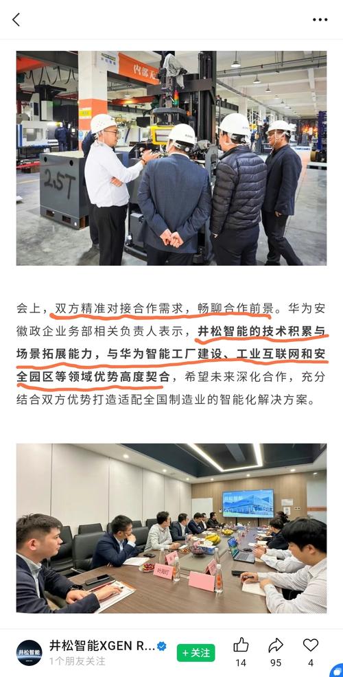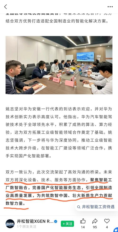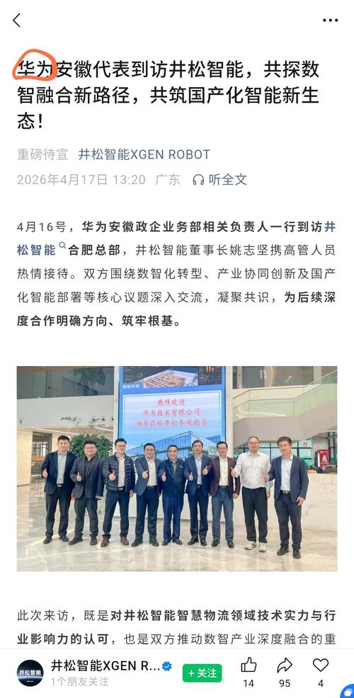 $井松智能(SH688251)$华为安徽政企业务部相关负责人一行到访井松智能合肥总部,井松智能董事长姚志坚携高管人员热情接待。双方围绕数智化转型、产业协同创新及国产化智能部署等核心议题深入交流,凝聚共识,为后续深度合作明确方向、筑牢根基。