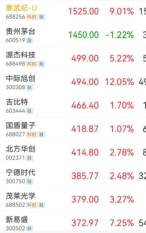 第一名:寒武纪,俗称寒王,股价1525,科创板—AI芯片龙头 第二名:贵州茅台,茅子,股价1450沪市主板—白酒龙头 第三名::源杰科技,股价499,科创板—光芯片龙头 第四名:中际旭创,494,创业板—cpo龙头 第五名:吉比特,466.4,沪市主板—游戏行业 第六名:国盾量子,418.87,科创板—量子科技 第七名:北方华创,418.87,深市主板—半导体设备龙头 第八名:宁德时代,385.7...