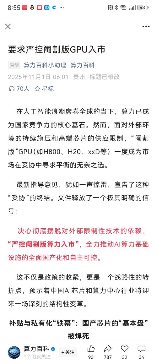 换券商冲科创板!AI芯片"硬核玩家"燧原科技:背靠腾讯国家队,要破算力垄断? 11月1日,燧原科技换帅中信证券冲刺上市的消息,给国产AI芯片圈投下一颗"深水炸弹"。这位2018年出生的"算力小将",短短几年就从初创公司熬成行业龙头,背后藏着不少故事。 来龙去脉:七年逆袭成"国产GPU希望" 2018年3月,燧原科技在上海敲下注册章,一出道就喊出"做中国自己的云端AI芯片"。起初面对英伟达的"泰山压...
