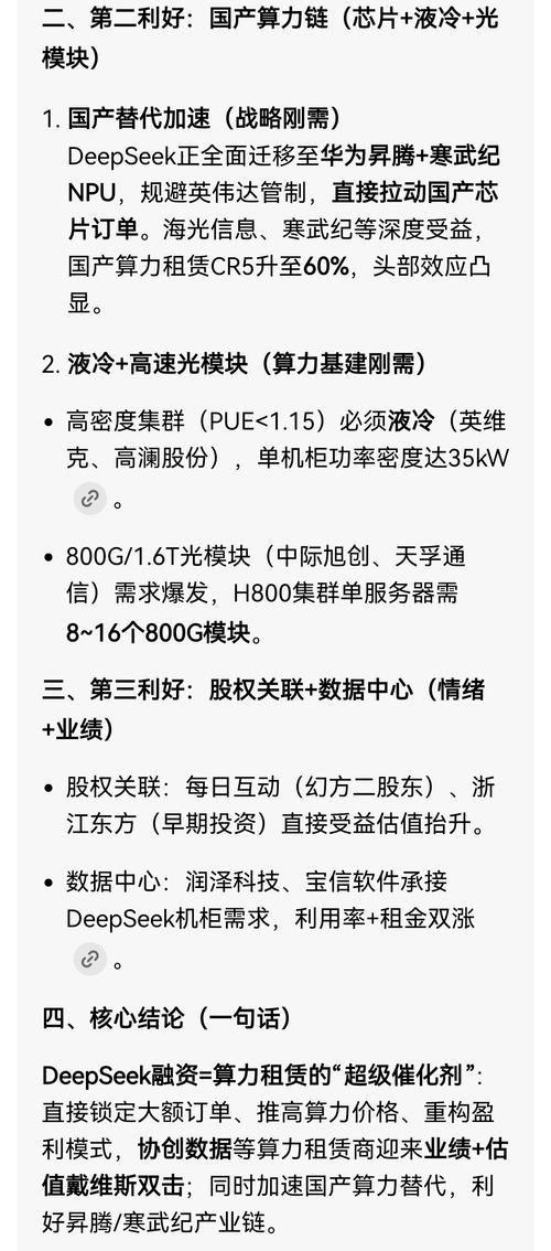 $协创数据(SZ300857)$Deepseek融资最利好:算力租赁(含服务器/集群交付),核心是“算力饥渴+国产替代+量价齐升”三重强逻辑。协创数据等算力租赁商迎来业绩+估值戴维斯双击;同时加速国产算力替代,利好昇腾/寒武纪产业链。