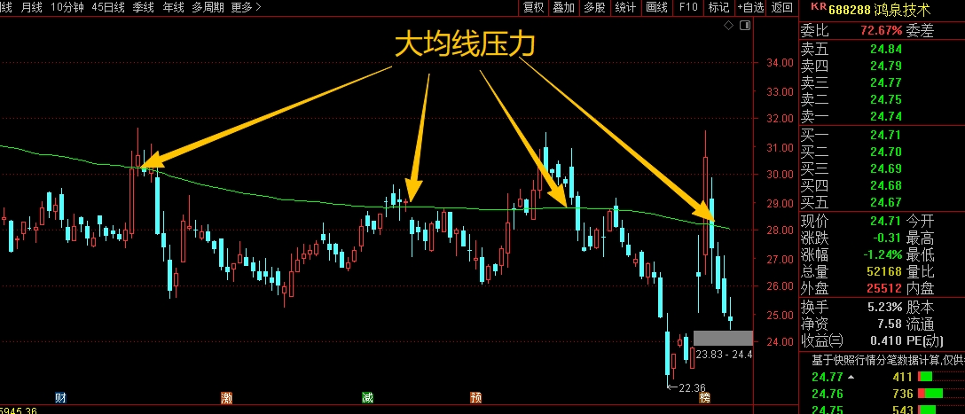 $鸿泉技术(SH688288)$中期趋势本身是走弱的,主要是前期高位回落下来,跌破大均线后,一直就在大均线下方横盘震荡,偶尔反弹也没有能完全站稳,近期跌破后加大了震荡幅度,不太好把握节奏,整体来看不宜重仓。短线来看,盘面整体还是要盯着大均线28.03位置的得失,能拉起来站稳都好说,但如果拉不起来就还是要谨慎应对,不要乱抄底和加仓。