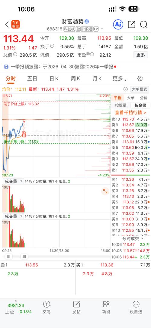 $财富趋势(SH688318)$根据中信证券发布的2026年第一季度业绩,并结合财富趋势(688318)的历史财报数据进行推算,财富趋势2026年第一季度的业绩很可能出现显著增长。 中信证券2026年第一季度业绩表现 中信证券作为行业龙头,其2026年第一季度业绩表现非常亮眼,起到了“牛市旗手”的作用,为整个券商板块注入了强劲信心。 *营业收入:231.55亿元,同比增长40.91% *归母净利润...