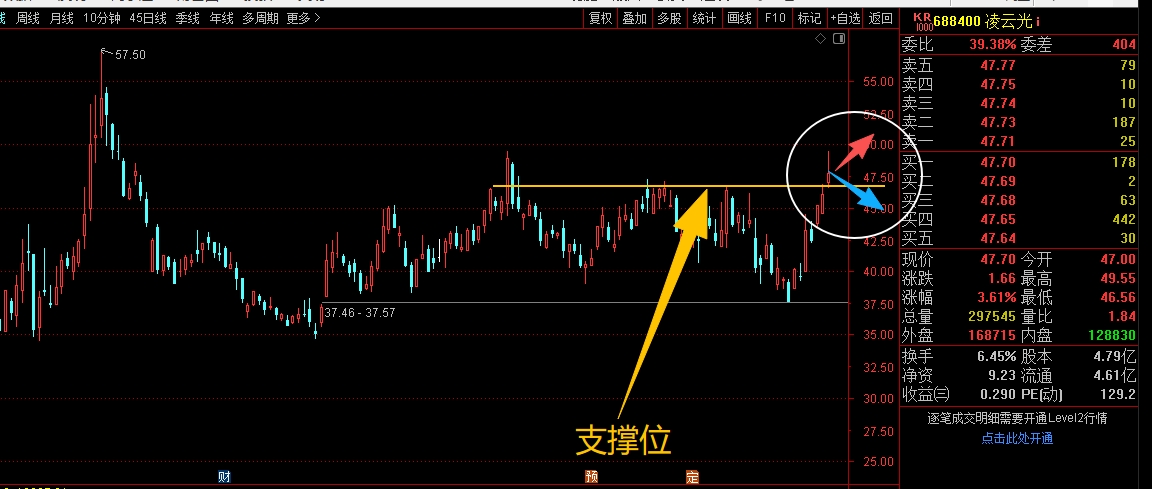 $凌云光(SH688400)$中期趋势主要是一个大的横盘震荡形态,近期短线连续的震荡拉升,效果不错,目前这里拉起来回到了前期高位的附近,接下来重点看能否继续拉高,同时回落的话主要是看脚底横线位置的支撑,能稳住就没问题,但有效跌破就要注意继续回落调整的动作了,需要控制好仓位谨慎应对。