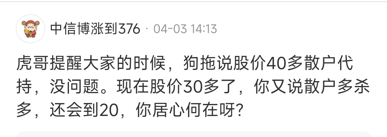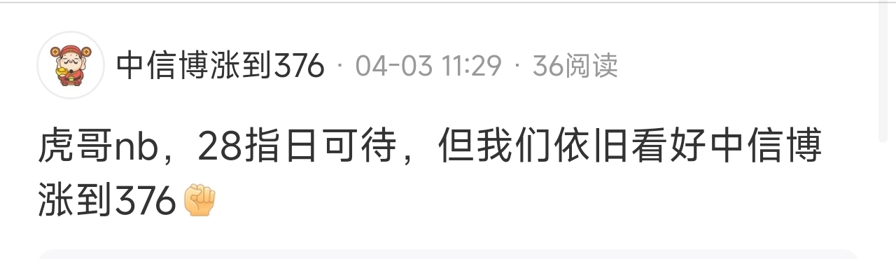 口嗨牛逼啊,记录一下,省的口嗨又删帖了。日期都是4.3吧,上午发帖剑指28,下午立马把锅甩给我,我还在想28怎么没人说了,我记得还有好多人恐慌28呢,原来口嗨做多了啊,这个28就当是我的说的吧。口嗨真准,股神级别的。小迷弟门得跟上别掉队。