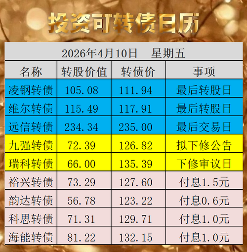 原文发送于昨日晚间自媒体。 10日为凌钢转债、维尔转债最后转股日。凌钢转债税后赎回价109.6元高于转股价值,而维尔转债税后赎回价114.4元低于当前转股价值。转股还是等待赎回,投资者需要根据自身风险承受能力选择。 10日为远信转债最后交易日,如果投资者忘记操作,还可以在15日最后转股日之前转股卖出。 九强转债满足下修条件,公司提出下修议案,利好转债,详见下修信息列表。 10日为瑞科转债下修审议日...