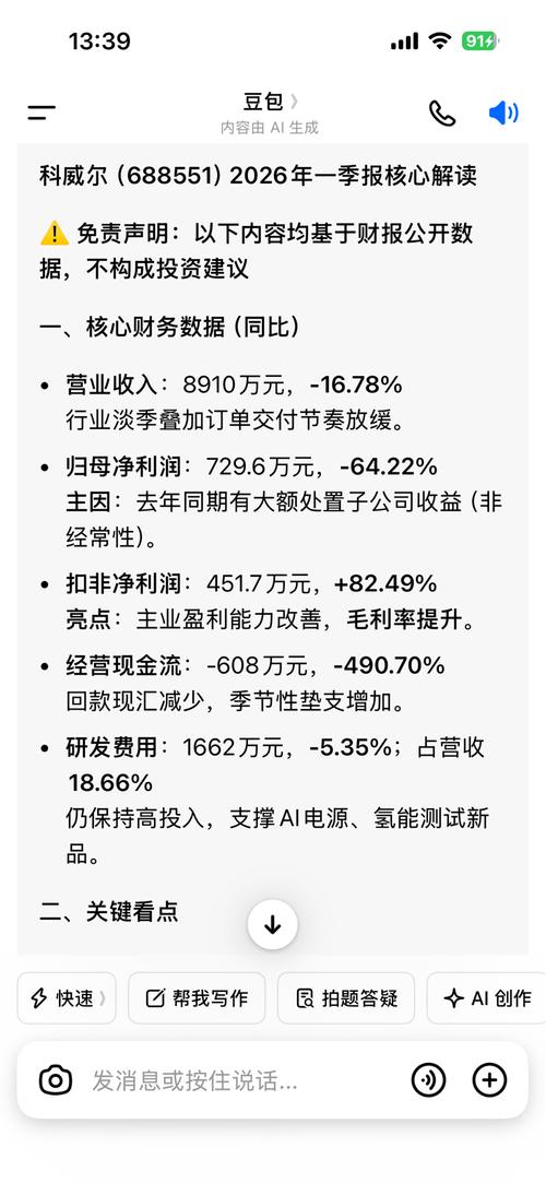 $科威尔(SH688551)$2026年一季报净利润同比"腰斩",核心原因是去年同期有"卖资产"的一次性高基数。实际上,剔除这个干扰因素后,公司的主业盈利能力(扣非净利润)其实是大幅增长的。 去年同期有"外快":2025年一季度,科威尔处置了子公司股权,产生了约1900万元的非经常性投资收益。这笔钱直接垫高了去年的净利润基数。