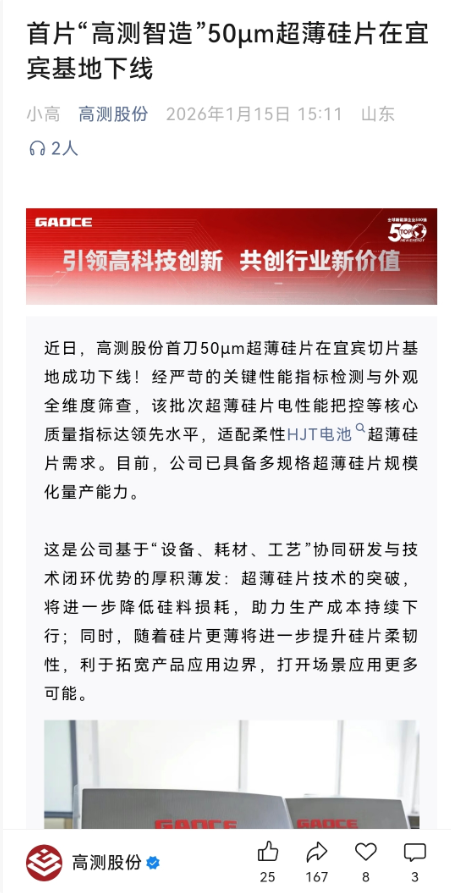 高测股份首刀50m超薄硅片在宜宾切片基地成功下线! 经严苛的关键性能指标检测与外观全维度筛查,该批次超薄硅片电性能把控等核心质量指标达领先水平,适配柔性HJT电池超薄硅片需求。目前,公司已具备多规格超薄硅片规模化量产能力。 50微米超薄硅片是一种厚度仅为50微米的单晶硅片,主要用于高效光伏电池(如异质结HJT电池),具有轻量化、高柔韧性和低成本优势,适用于太空光伏、可穿戴设备等领域。生产50微米超...