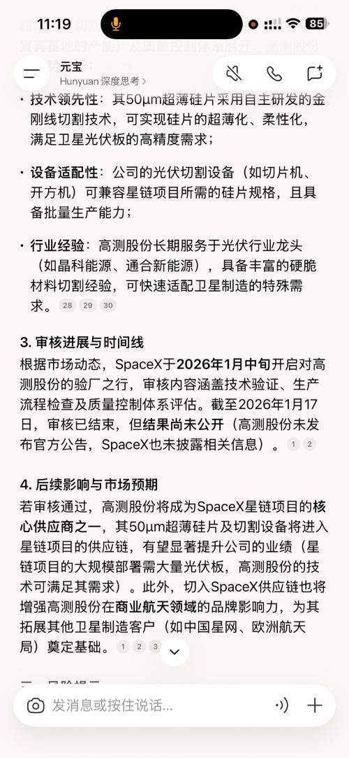 $高测股份(SH688556)$ 讲个故事: 高测股份(688556)官宣首刀50μm超薄硅片在宜宾切片基地成功下线,核心质量指标达领先水平,适配柔性HJT电池需求,且公司已具备多规格超薄硅片规模化量产能力。 -厚度:50微米,约为一根头发丝直径的一半(头发丝直径通常约80-100微米)。 -技术依托:“设备、耗材、工艺”协同研发的技术闭环优势。 -应用适配:契合柔性HJT电池对超薄硅片的需求,可...