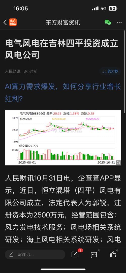 I象限投资者 更新于 10-31 18:47 1357次浏览 $电气风电(SH688660)$如果电风扇重组会10月开两家风电分公司吗?大家自己想。 85