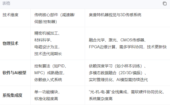 奥普特的机器视觉与3D传感系统在物理技术与AI模型融合的复杂度上,确实显著高于传统减速器、伺服系统和控制器,已具备支撑独立工业机器人与人形机器人“感知-决策-执行”闭环的核心能力,商业化落地正加速推进。 一、技术复杂度对比:视觉与传感系统要求更高 关键差异:传统部件更偏向“确定性工程”,而视觉与3D传感系统需应对动态、非结构化环境,必须依赖AI模型实现自适应识别与决策,技术门槛更高。 二、是否离独...