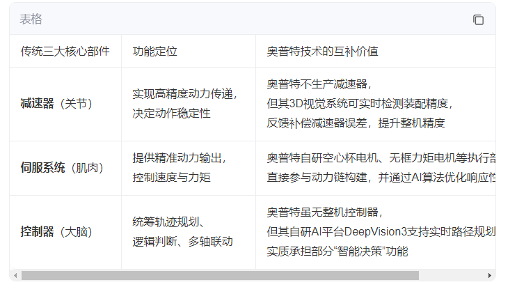 摘要:奥普特虽不直接生产减速器、伺服系统和控制器这三大传统核心部件,但凭借“视觉+传感+运控+AI”全栈技术能力,正从感知层向上游决策与执行层渗透,具备整合三大部件、主导智能机器人系统级解决方案的能力,为整机生产提供了现实可能性。 一、传统三大部件与奥普特技术的关系:从“骨骼肌肉”到“眼睛大脑”的协同进化 本质关系:传统三大件解决“如何动”,奥普特技术解决“看哪动、为何动、怎么聪明地动”。二者并非...