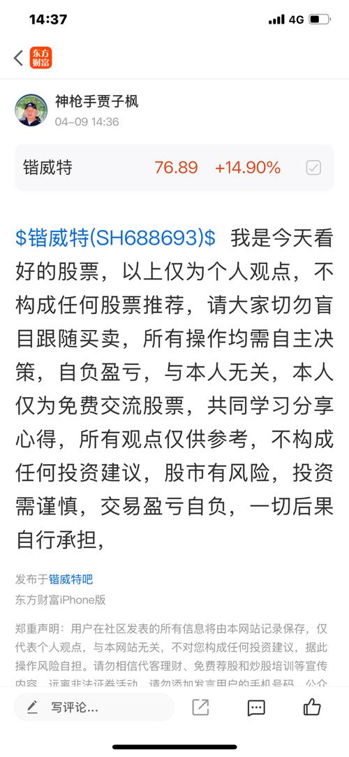 $锴威特(SH688693)$该股是我四月九号发文看涨的个股,仅为个人观点,不构成任何股票推荐,请勿盲目跟风买卖,所有操作均需自主决策、盈亏自负,与本人无关,本人仅做免费股票交流,观点仅供参考,股市有风险,投资需谨慎。