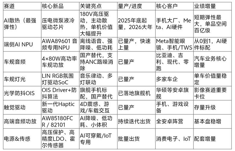 $艾为电子(SH688798)$希望跟投资艾为的人一起#炒股日记# 分析艾为电子:2026上半年:液冷驱动+NPU开始贡献明显营收。2026下半年:车规产品随临港测试中心投产加速放量。最强看点:液冷散热>AINPU>车规音频