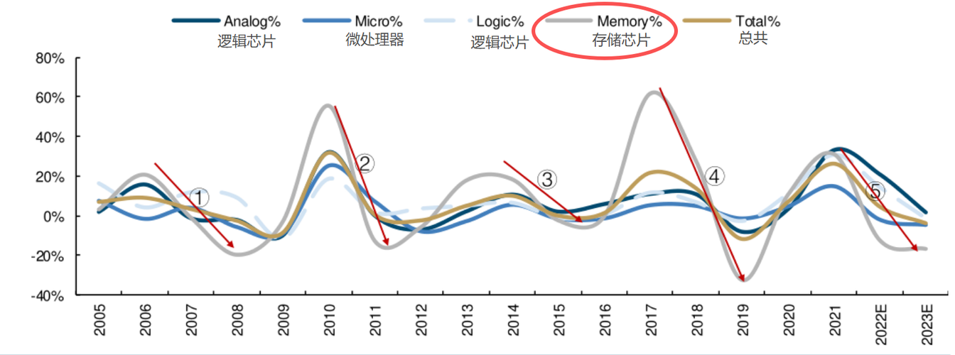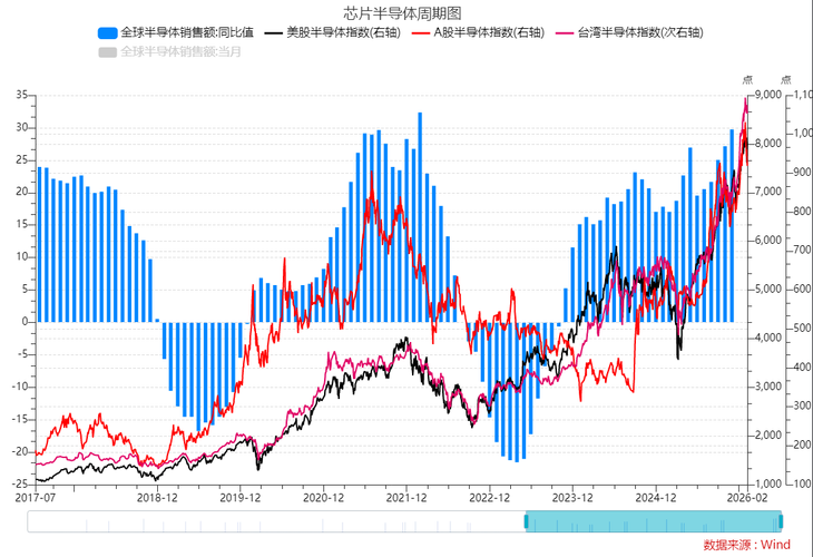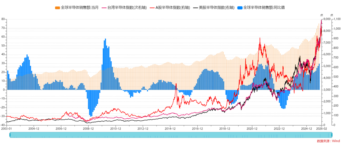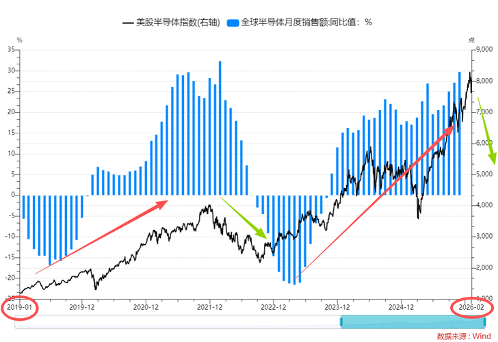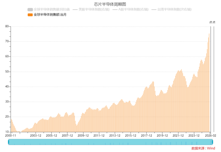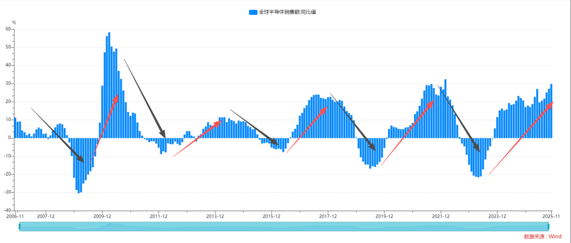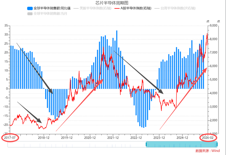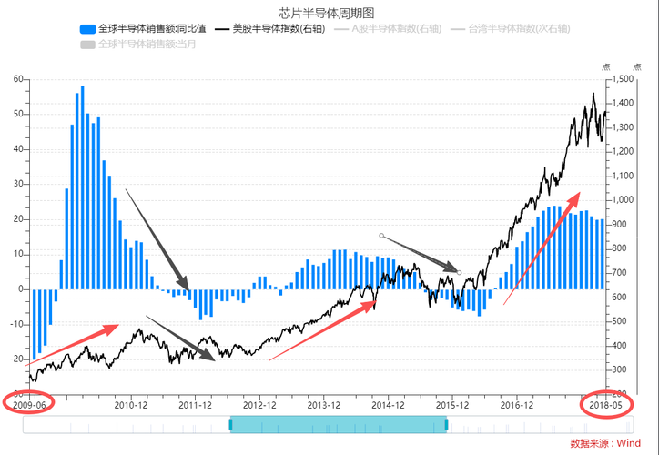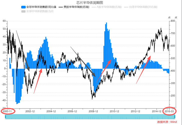 01 上图是全球芯片半导体近20年来的周期变化图,橙色的柱形图是全球半导体月度营收额,蓝色的柱形图是销售额的当月同比值,其余三根线的走势是同期的三个半导体指数变化。 如果把半导体行业的月度营收额单独拎出来,咱们能发现的信息量很少。但是如果把它转化为月度同比变化值,能很明显看出芯片半导体公司的周期变化规律: 因为这基本符合了库存周期,也称为基钦周期,2006年至今,这个行业已经经历了五轮周期,附上一...