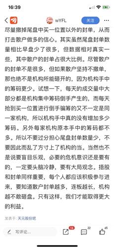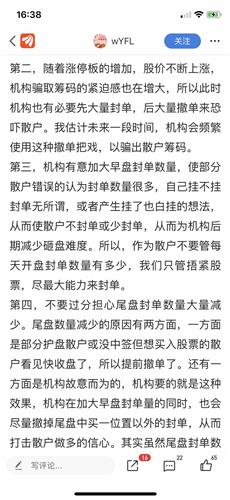 来自股友wYFL关于封单的问题。第一,所有未开板新股早盘时封单数量都相对较多,那是因为有多家机构在挂单争夺买一位置,没抢到买一位置的机构在开盘后不久撤单离去,所以开盘半小时后封单数量快速下降。抢到买一位置的机构也会趁机利用其他机构离去、封单大量减少的机会加紧倒手给散户施加精神压力,使散户感觉到成交量在增大,封单在减少,以迫使散户害怕交出筹码。第二,随着涨停板的增加,股价不断上涨,机构骗取筹码的紧迫...