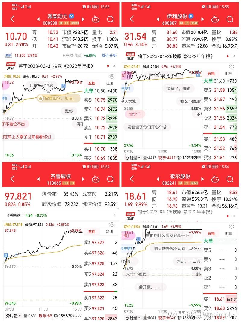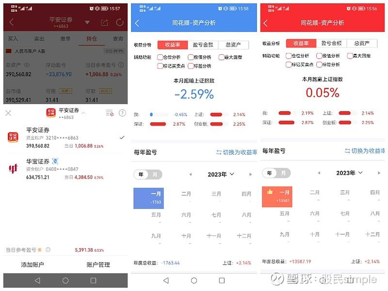 两个账户。今日合计盈利5391.38元,盘后总资产390560.82+634751.21=1025312.03元,融资664950元,净资产360362.03元。2023年合计盈利-1763.44+13587.19=11823.75元。今日操作:买入21手京沪废铁、1手盘龙,卖出3手歌尔、2手伊利、2手潍柴、20手齐鲁转债。今日大盘高开高走,放量大涨一波,上证指数涨1.01%,深证成指涨2.13%...