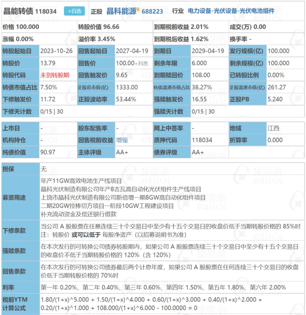 傻馒大天才个人看法:顶格申购,预计中0.12签,正常价值预估125。晶科转债:(正股代码:688223,配债代码:726223)评级:AA+评级,可转债评级越高越好。发行规模:100亿,规模大,可转债规模越大流动性越好。回售条款:有下调转股价:15/30,85%,条件较严苛。转股价值:晶科能源今日收盘价13.33,转股价13.79,转股价值=转债面值/转股价*正股价=100/13.79*13.33...