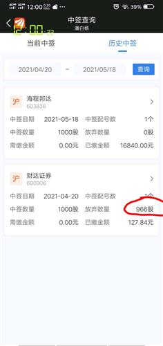 不到一个月中了两签,财达证券竟然忘了缴款,结果余额只给我缴了34股!太悲催了!