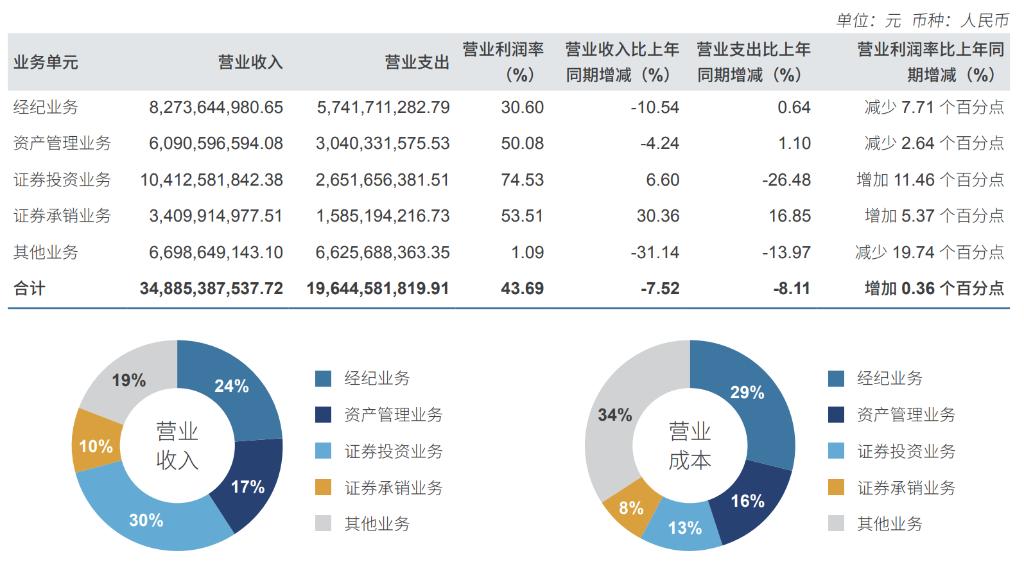 8月30日,中信证券发布2022年半年度报告。数据显示,中信证券总资产达14031.87亿元,较上年末增长9.74%;营业收入为348.85亿,同比减少7.52%;归属于母公司股东的净利润为111.96亿,同比减少8.21%。中信证券主营业务分行业情况来源:上交所从主营业务来看,证券投资业务在中信证券营业收入中占比最高,达30%;其次是经纪业务,占比24%。证券投资业务营业利润率达到74.53%...