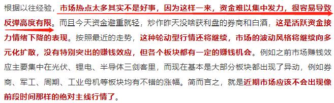 1.活跃资金接力情绪下降!今天指数继续震荡上行,题材板块继续多向开花。煤炭、有色资源股受追捧;光伏产业链全天大涨上演涨停潮,HIT电池、BIPV等概念股纷纷大涨,有机硅下午狂飙。这样的热点分散化的走势还是面临着我昨天在《光伏产业链有新机会!》一文讲的问题:根据以往经验,市场热点太多其实不太好,资金难以集中发力,这样很容易导致反弹高度有限。因此,我们可以推演出目前市场并没有脱离震荡市,但指数越...
