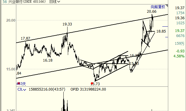 1,兴业银行上涨至大级别上升通道上轨,遇强压力将大级别回调; 2,回调关注下方18.85的强支撑,即反复验证的上升趋势线附近。