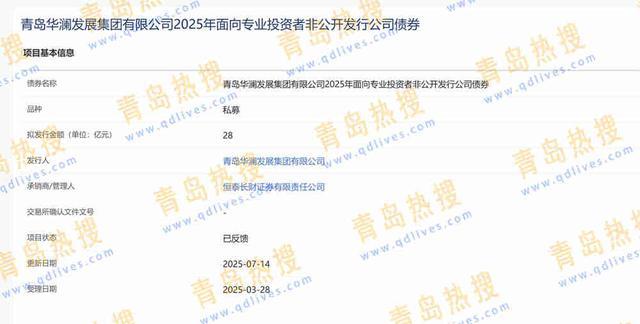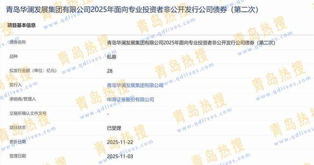 青岛热搜网获悉,11月22日,“青岛华澜发展集团有限公司2025年面向专业投资者非公开发行公司债券(第二次)”申发进度更新,项目状态为“已受理”。 该债券为私募债,拟发行金额为28亿元,承销商为申港证券股份有限公司。 2025年3月28日首次“青岛华澜发展集团有限公司2025年面向专业投资者非公开发行公司债券”被上交所受理,其最后一次进度更新为7月14日,其拟发行金额同样是28亿元,承销商是恒泰长...