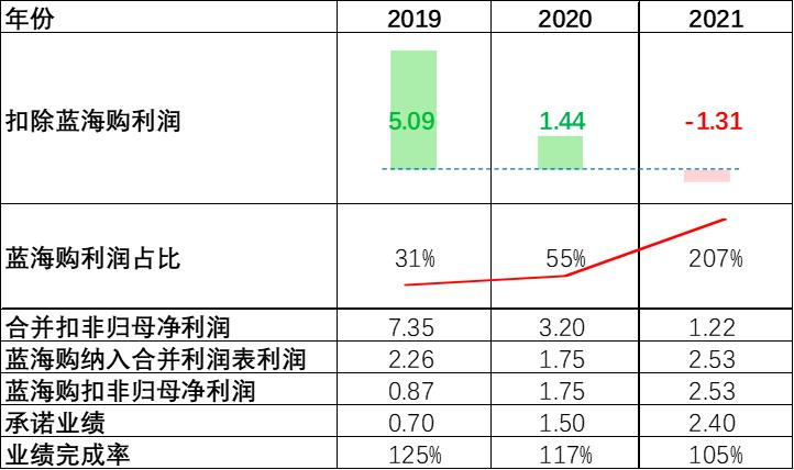 $我爱我家(SZ000560)$什么?我爱我家竟然盈利全靠新并购营销策划子公司?2019年,我爱我家支付6.5亿现金并购湖南蓝海购,当年湖南蓝海购净利润扣非归母净利润0.87亿,纳入合并利润表净利润2.28亿(即湖南蓝海购并购日前亏损1.3亿)。从2019年~2021年,湖南蓝海购对于我爱我家的合并净利润的贡献率逐年上升,从2019年的31%升至2021年的207%。2021年,湖南蓝海购扣非归母...