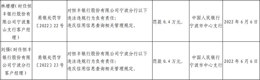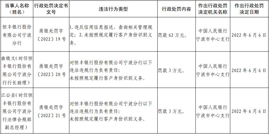6月10日,人民银行宁波中心支行公布的条行政处罚信息显示,恒丰银行因存在违反信用信息报送、查询相关管理规定,以及未按照规定履行客户身份识别义务等2项违规,被罚62万元。同时,恒丰银行宁波分行行长助理,宁波分行法律合规部副总经理对反洗钱违规(未按照规定履行客户身份识别义务)负有责任,均被罚3万元。恒丰银行宁波分行客户经理、恒丰银行宁波象山支行客户经理则对信用信息管理违规(违反信用信息报送、查询相关管...