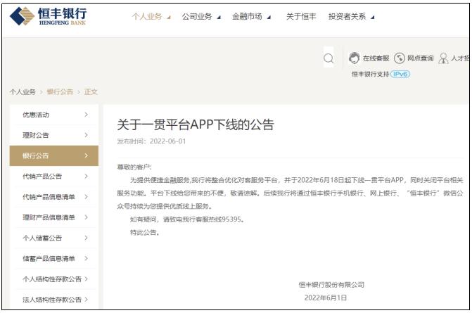 来源:移动支付网作者:薛小易6月1日,恒丰银行发布公告称,其将整合优化对客服务平台,于2022年6月18日起下线一贯平台App(下称“一贯App”),同时关闭平台相关服务功能。后续将通过恒丰银行手机银行、网上银行、“恒丰银行”微信公众号提供线上服务。目前,在OPPO手机软件商店仍可搜索并下载一贯App,但因未适配系统,无法打开。据《银行科技研究社》了解,恒丰银行于2014年推出一贯App,支持...