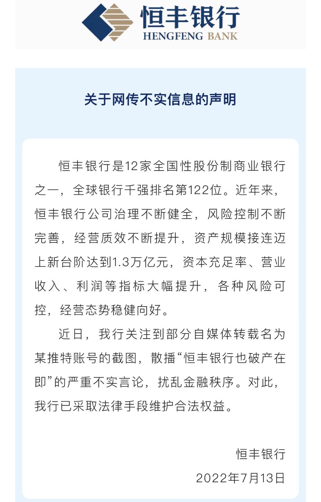 金融虎讯7月13日消息,今日,恒丰银行发布《关于网传不实信息的声明》称:近日,我行关注到部分自媒体转载名为某推特账号的截图,散播“恒丰银行也破产在即”的严重不实言论,扰乱金融秩序。对此,我行已采取法律手段维护合法权益。声明称,恒丰银行是12家全国性股份制商业银行之一,全球银行千强排名第122位。近年来,恒丰银行公司治理不断健全,风险控制不断完善,经营质效不断提升,资产规模接连迈上新台阶达到1...