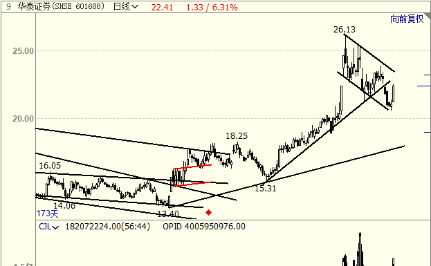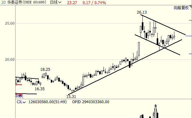 1,华泰证券目前处于旗形整理中,且上周五在旗形下边界形成大阳线,后市持续看涨; 2,但由于此次回调幅度较深,股价很难直接向上突破,至少旗形上边界就是一道难以逾越的大关,所以还是要做好打持久战的准备。