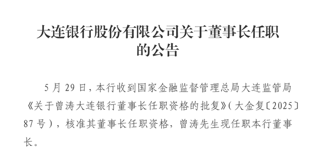 文|刘振涛 等了2年时间,知名城商行大连银行终于迎来新董事长! 6月5日,大连银行发布公告称,5月29日,收到了大连金融监管局《关于曾涛大连银行董事长任职资格的批复》,核准了曾涛董事长任职资格,曾涛正式担任大连银行董事长。 公开资料显示,2023年2月,大连银行曾发布公告称,彭寿斌因工作调动,辞去了该行董事长职务,董事长一职暂时由行长王旭代为履行。 而2024年6月,大连银行发布公告称,因工作调整...