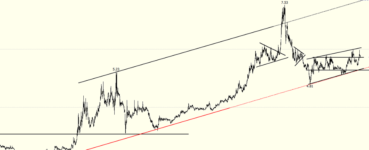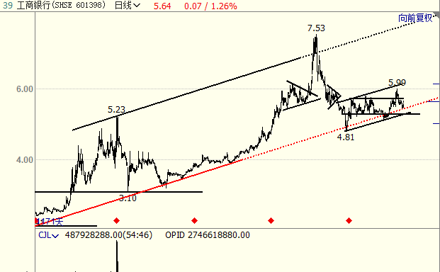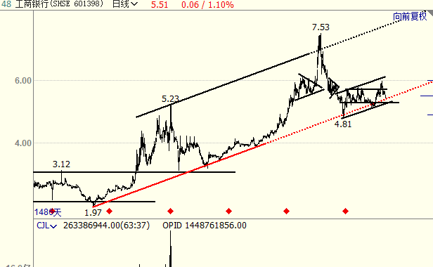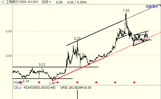 1,工商银行最值得关注的还是它趋势级别的上升趋势线,股价在该区域宽幅震荡上行,一轮上升趋势值得期待; 2,由于左侧历史行情中两个三角形成交密集代表强压力,所以行情不会轻易突破,而一旦突破,则上升势就得到确立,上涨到通道上轨就势在必然。