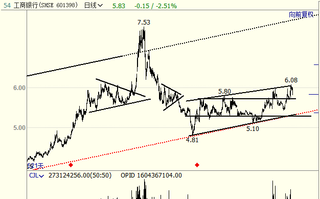 1,工商银行在趋势级别的上升趋势线附近宽幅震荡,趋势行情潜力非常大,上涨目标看到趋势通道上轨; 2,现阶段股价在宽幅通道内震荡,且股价突破了5.73的强压力,短期上涨目标看到通道上轨;