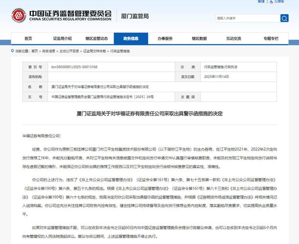 11月14日,厦门证监局发文称,经查,华福证券作为原新三板挂牌公司厦门市江平生物基质技术股份有限公司(以下简称“江平生物”)的主办券商,在江平生物2021年、2022年2次定向发行推荐工作中,未能充分勤勉尽责,未对江平生物有关信息披露文件和定向发行申请文件认真履行审慎核查职责,未能及时发现江平生物定向发行说明书存在虚假记载的情形,未能保证公司所出具的推荐工作报告以及对江平生物定向发行说明书核查意见...